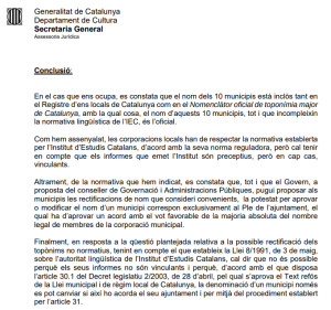 L’afirmació que els informes de l’IEC no són vinculants és absurda, i vam demanar còpia d’aquell informe jurídic que citava la respota de l’Oficina de Garanties Lingüístiques per veure en quins fonaments es basaven per fer una afirmació així. Rebuda còpia de l’informe, hem costatat que s’hi cita tota la legislació afectada per l’assumpte EXCEPTE l’article 18.1 de la Llei 1/1998, de política lingüśitica, que és justament el que fa que els informes de l’Oficina d’Onomàstica de l’IEC siguin vinculants. Per tant, la conlcusió a què arriba l’informe és falsa. Fins i tot no es pot al·legar que els informes de l’IEC només siguin obstatius, com es podria deduir del contingut dels arts. 3.2 i 5.1 del Decret 139/2007; però l’art. 18.1 de la Llei 1/1998 (“els topònims de Catalunya tenen com a única forma oficial la catalana, d’acord amb la normativa lingüística de l’Institut d’Estudis Catalans”) fa obvi que els informes són vinculants.