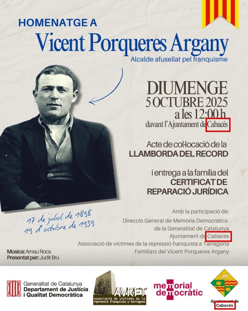 L’Associació de víctimes de la repressió franquista a Tarragona ha organtzat un homenatge a Porqueres pel proper 5 d’octubre. Es col·locarà una llamborda del record a l’Ajuntament. Hi col·laboren el Departament de Justícia, el Memorial Democràtic i el mateix Ajuntament de Cabassers. Doncs als cartells difosos per l’Ajuntament per anunciar l’acte hi han fet anar el topònim castellà imposat pel franqusme Cabacés. És impossible imaginar-se una manca de respecte més greu i una mostra de cinisme més extrema que aquesta; homenatjar l’aclalde que va normalitzar l’ús de la forma Cabassers amb la grafia que van imposar els seus assassins, Cabacés.
