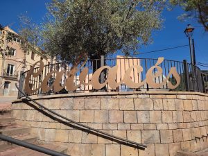 Lletres metàl·liques formant la grafia “Cabacés” al parc de la plaça de la bàscula.